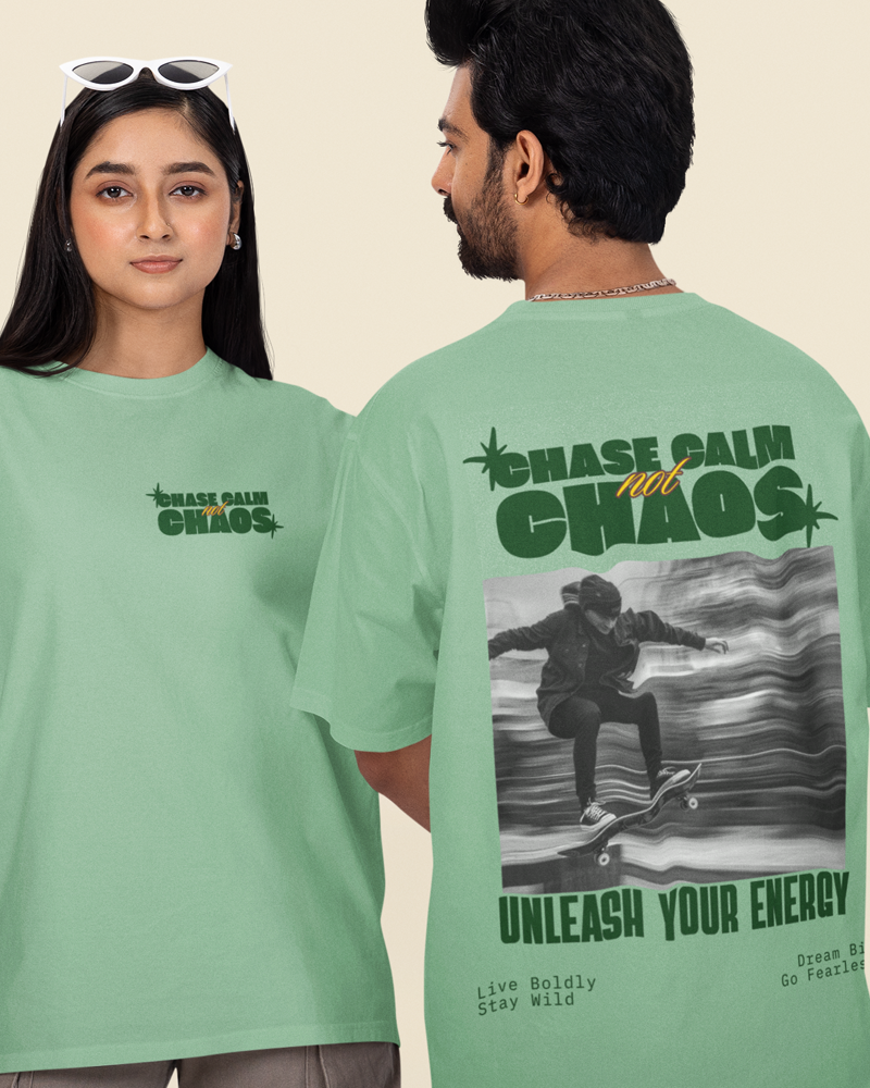 The "Chase Calm Not Chaos" oversized T-shirt is a bold, stylish statement piece designed for comfort and self-expression. Made from soft, breathable fabric, it features a relaxed fit with a slightly longer length and wide sleeves for maximum comfort. The front showcases the eye-catching phrase "Chase Calm Not Chaos" in striking, modern typography, inspiring a sense of peace and mindfulness. Perfect for casual outings or lounging, this T-shirt combines contemporary fashion with a positive message, making it an essential addition to any wardrobe.